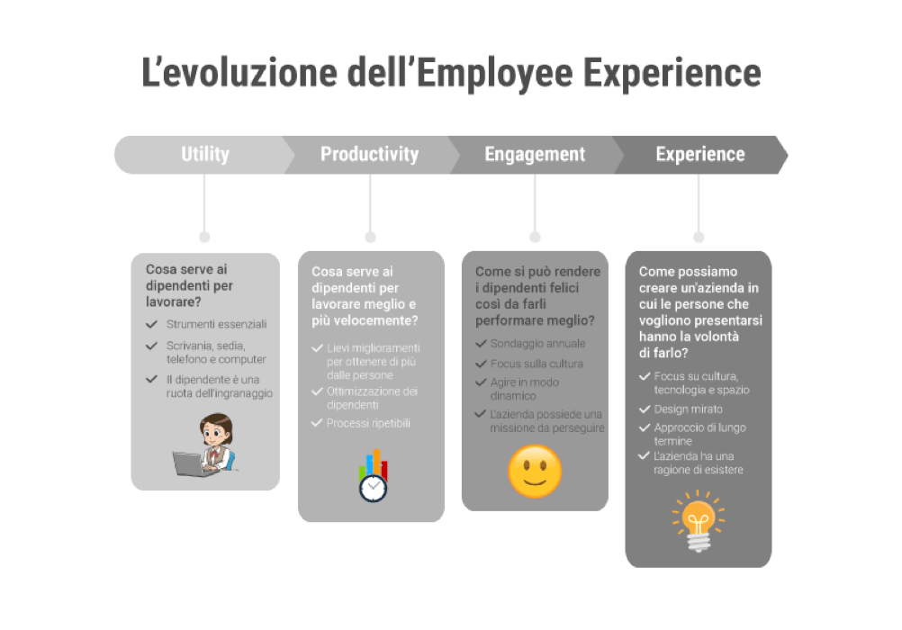 Dopo le fasi legate alla produttività e quella legata all’ “engagement”, stiamo ora vivendo la fase “esperienziale”; un’organizzazione moderna non può prescindere dalla presa d’atto della necessità di acquisire consapevolezza di questo ed agire di conseguenza.