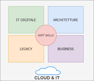 Il diagramma mostra come il cloud, per funzionare, necessiti di una collaborazione tra business, architetture, reparto digital e il supporto dei sistemi legacy. Nell’IT del futuro il business deve essere al centro, incluso nel processo decisionale e attivo. Attraverso i suoi input si possono raggiungere risultati significativi per l’azienda e sostenibili nel tempo. La componente Digital, che è spesso il driver trainante per le innovazioni tecnologiche in ambito IT dovrà collaborare con la componente architetturale e strategica per trovare soluzioni alle sfide che si pone. Infine, il mondo legacy deve essere incluso e reso parte del processo di trasformazione.